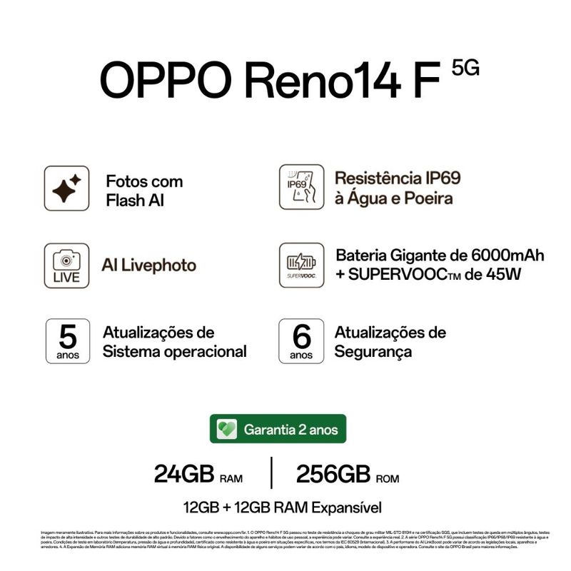 Resistente à água e poeira (IP66/IP68/IP69), o Reno14 F foi feito para acompanhar você em qualquer ambiente. Por dentro, ele traz desempenho de sobra com o poderoso processador MediaTek Dimensity 8350, acompanhado de 12GB de RAM + 12GB de RAM expansível e 256GB de armazenamento interno.