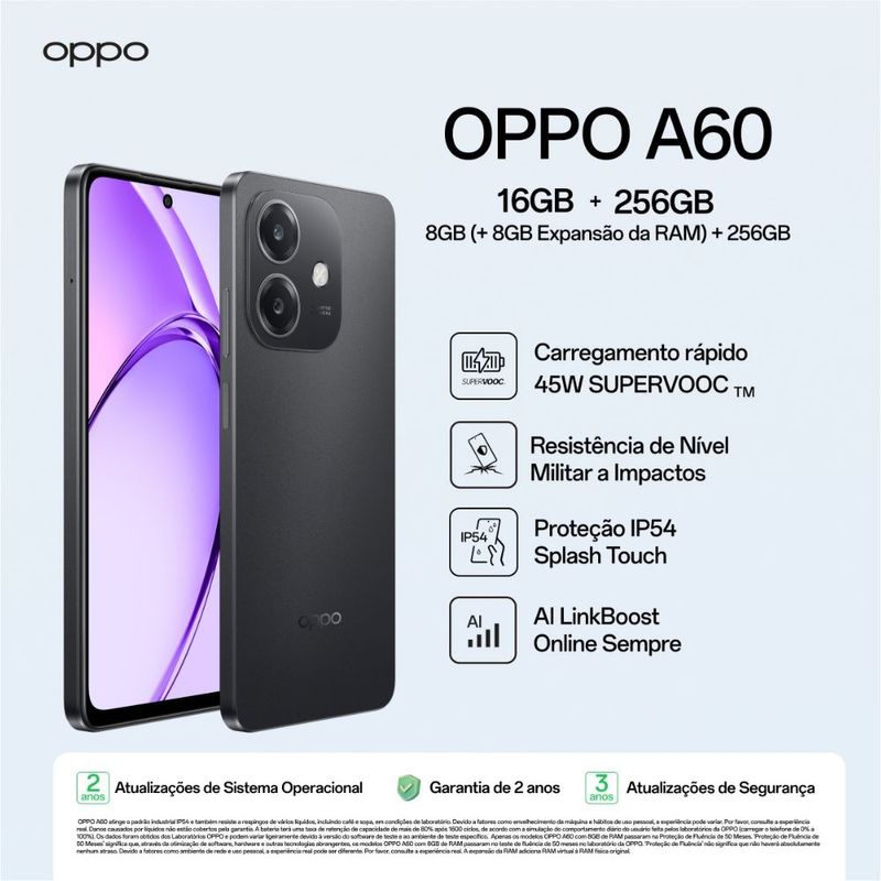 O OPPO A60 é a escolha ideal para quem procura potência, beleza e durabilidade em um único smartphone — perfeito para acompanhar o seu ritmo com tecnologia e estilo.